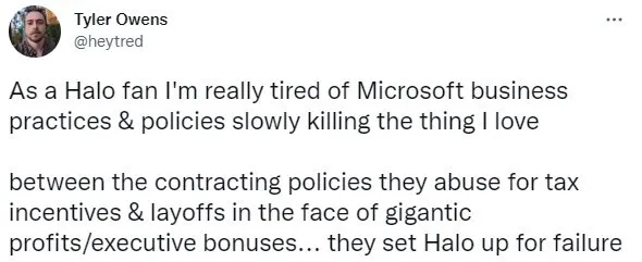 Své k současné situaci napsal i další bývalý zaměstnanec Tyler Owens, podle něhož velkou vinu nese i Microsoft. „Jako fanoušek Halo jsem unavený z obchodní politiky Microsoftu, která pomalu zabíjí věc, kterou miluji," napsal na twitter.