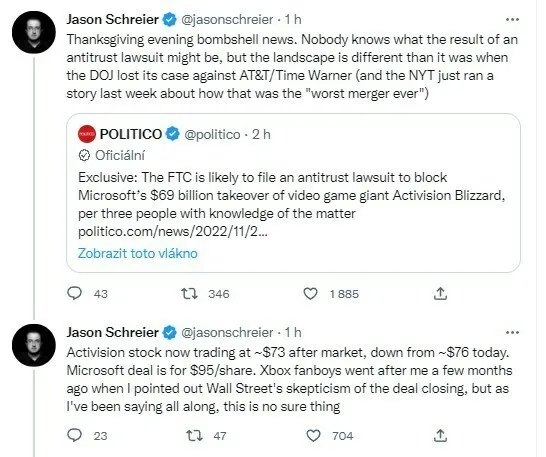 Novinář Jason Schreier na twitteru zmínil, že antimonopolní žaloba neznamená, že by nakonec akvizice neprošla, ale znamenala by docela velkou soudní bitvu.