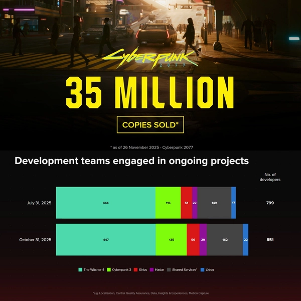 Navíc je o ní stále obrovský zájem a prodávala se za poslední čtvrtletí lépe než ve stejném období před rokem. K tomu určitě přispěla i nově vydaná verze pro konzoli Nintendo Switch 2. Studio si také pochvaluje zařazení základní hry do nabídky předplatného PlayStation Plus Extra a Premium, protože to přispělo k většímu zájmu o rozšíření Phantom Liberty.