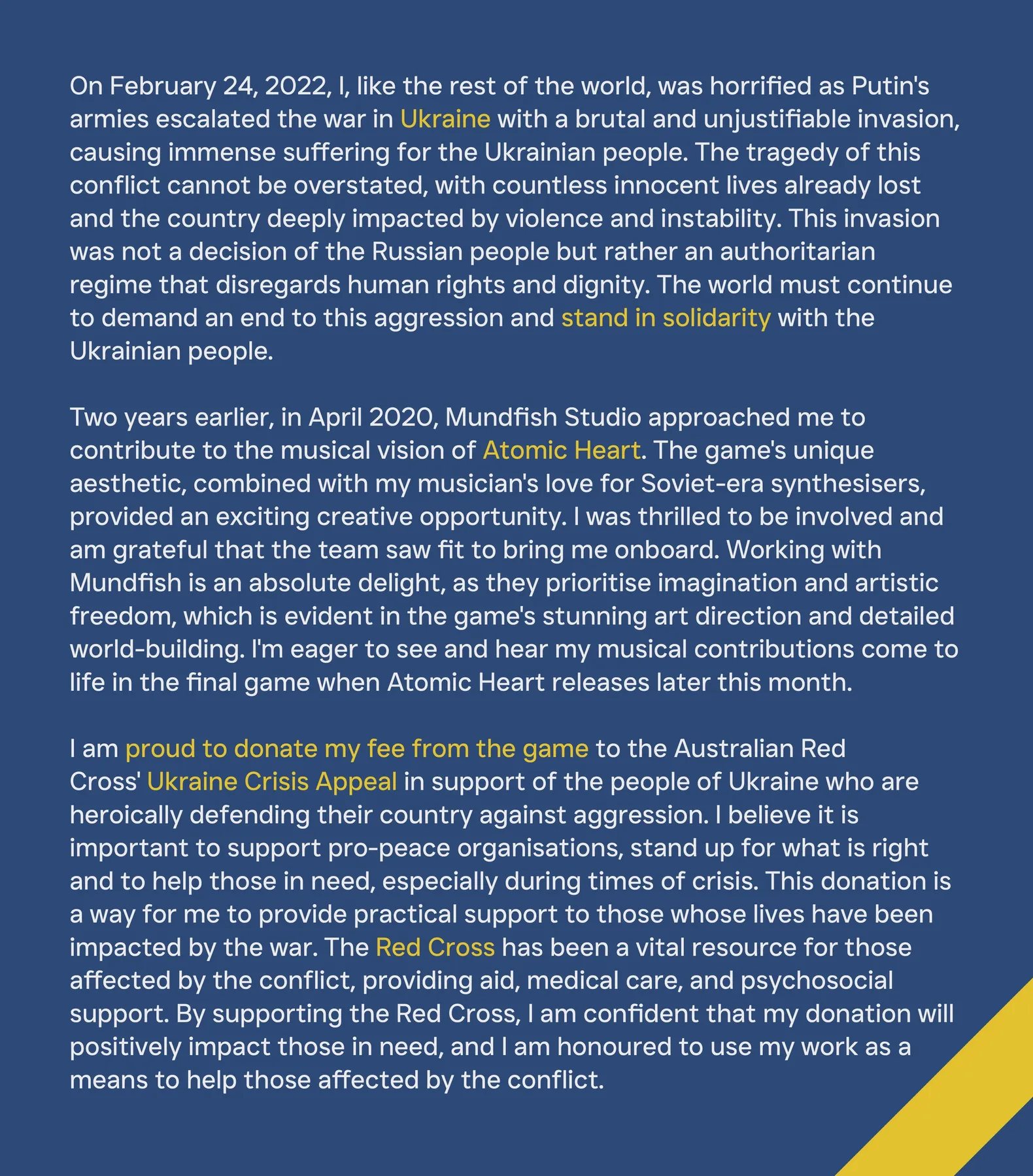 Mick Gordon ve svém prohlášení zdůraznil, že jeho dar není zamýšlen jako distancování od hry, jejíž vývoj začal už v roce 2017, tedy dlouho předtím, že se Putim rozhodl napadnout Ukrajinu. Sám na hře pracoval od dubna 2020. Naopak zmiňuje, že spolupráce s vývojáři probíhala dobře a je rád, že jeho hudba hru doprovodí. „Jedinečná estetika hry v kombinaci s mojí láskou k hudebním nástrojům ze sovětské éry poskytla vzrušující tvůrčí příležitost. Byl jsem nadšený, že jsem se vývoje zúčastnil, a jsem rád, že si mě tým vybral. Těším se, až uvidím a uslyším, jak má hudba ožije ve finální hře,“ říká. „Tato invaze nebyla rozhodnutím ruského lidu, ale spíše autoritářským režimem, který nerespektuje lidská práva a důstojnost,“ dodává k současnému konfliktu, s nímž nesouhlasí.