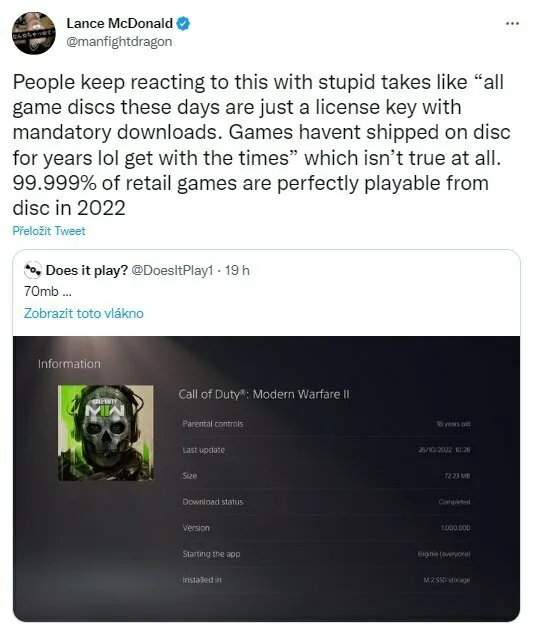 Krabicová verze hry Call of Duty: Modern Warfare II obsahuje na disku jen 72MB velký soubor