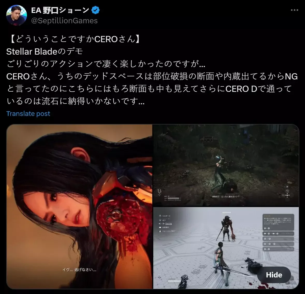 „CERO, bylo nám řečeno, že náš Dead Space není dostatečně dobrý, protože byl vidět průřez poškozenými částmi těla, případně byly vidět orgány. Ale tady je také vidět vše. Jen bych chtěl dodat, aby nedošlo k nedorozumění. Nemám žádný problém se Stellar Blade. Je to zábavná hra a doporučuji všem, aby si ji koupili. Tohle je čistě stížnost na nejednoznačné hodnocení v Japonsku a mohu uvést mnoho příkladů,“ napsal na sociální síti X. Stížnost Noguchiho se dá určitě pochopit, a je vlastně i škoda, že hra Dead Space nedostala hodnocení a nemohla v Japonsku vyjít, alespoň ne oficiální cestou.