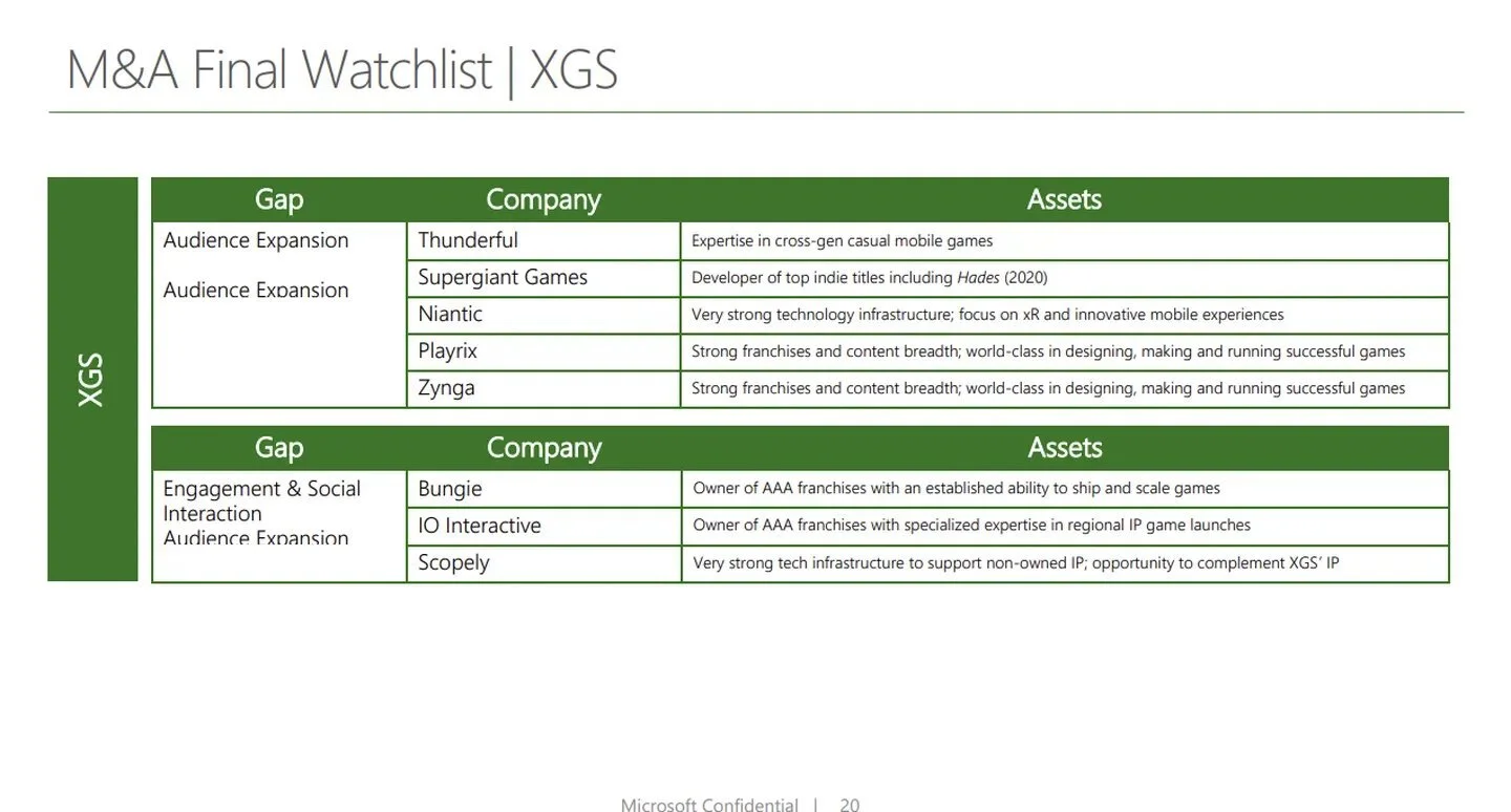 V tomto dokumentu je pak zmíněno i studio Bungie, které ale nakonec získala společnost Sony. „Akvizice Bungie by zajistila získání cenné IP – Destiny (a její komunity),“ stojí v popisku, navíc s tím, že by Bungie pomohlo Xbox Game Studios s vývojem live service her. Tedy to, proč Bungie nakonec koupila Sony. Microsoft v dokumentu také uvedl, že u Bungie hrozí vysoké riziko vyhoření, ale zároveň dodal, že Destiny byla jednou z nejúspěšnějších a nehranějších her v rámci předplatného Xbox Game Pass. Společně s Bungie v dokumentu uvádí Microsoft jako potencionální cíle pro akvizici i studio IO Interactive (Hitman série), případně společnosti Thunderful, Supergiant Games, Niantic, Playrix a Zynga (tu získala společnost Take-Two Interactive).