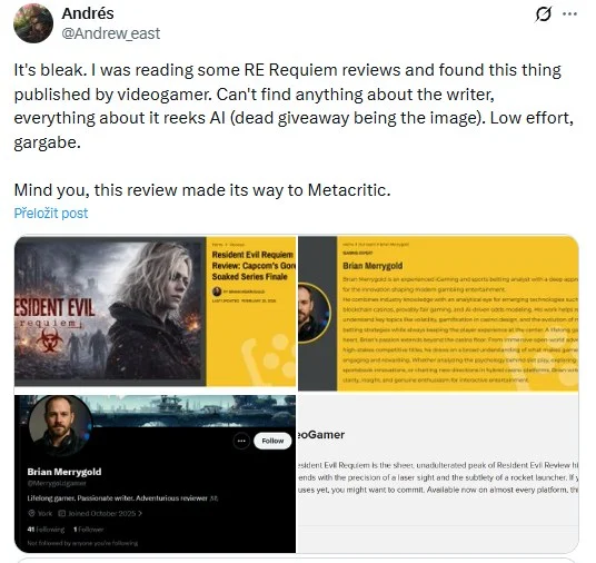 Na Metacritic se dostala recenze na Resident Evil Requiem, kterou napsala umělá inteligence