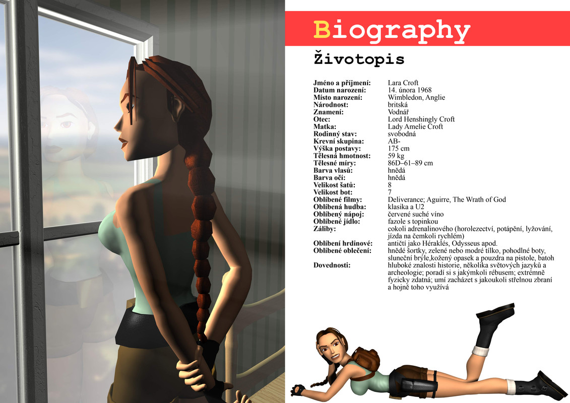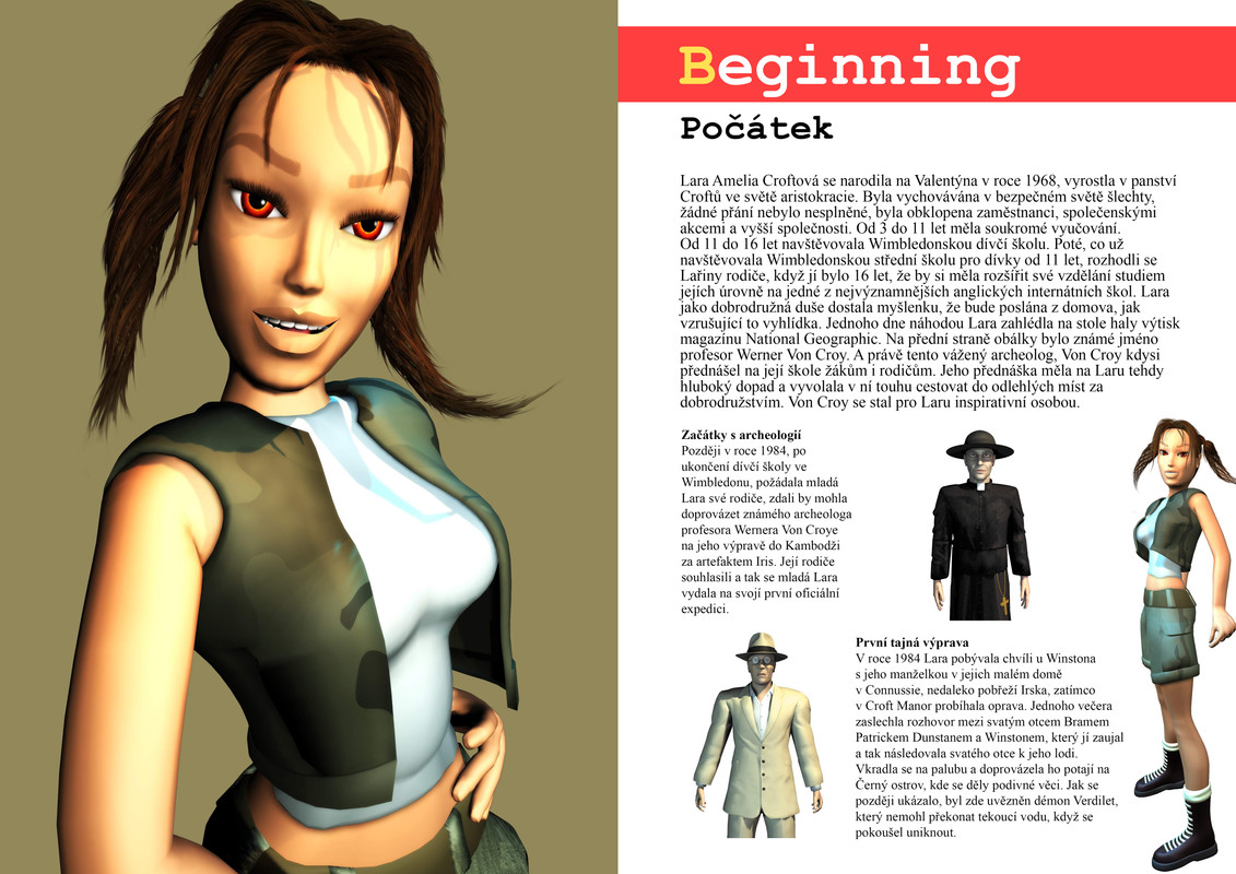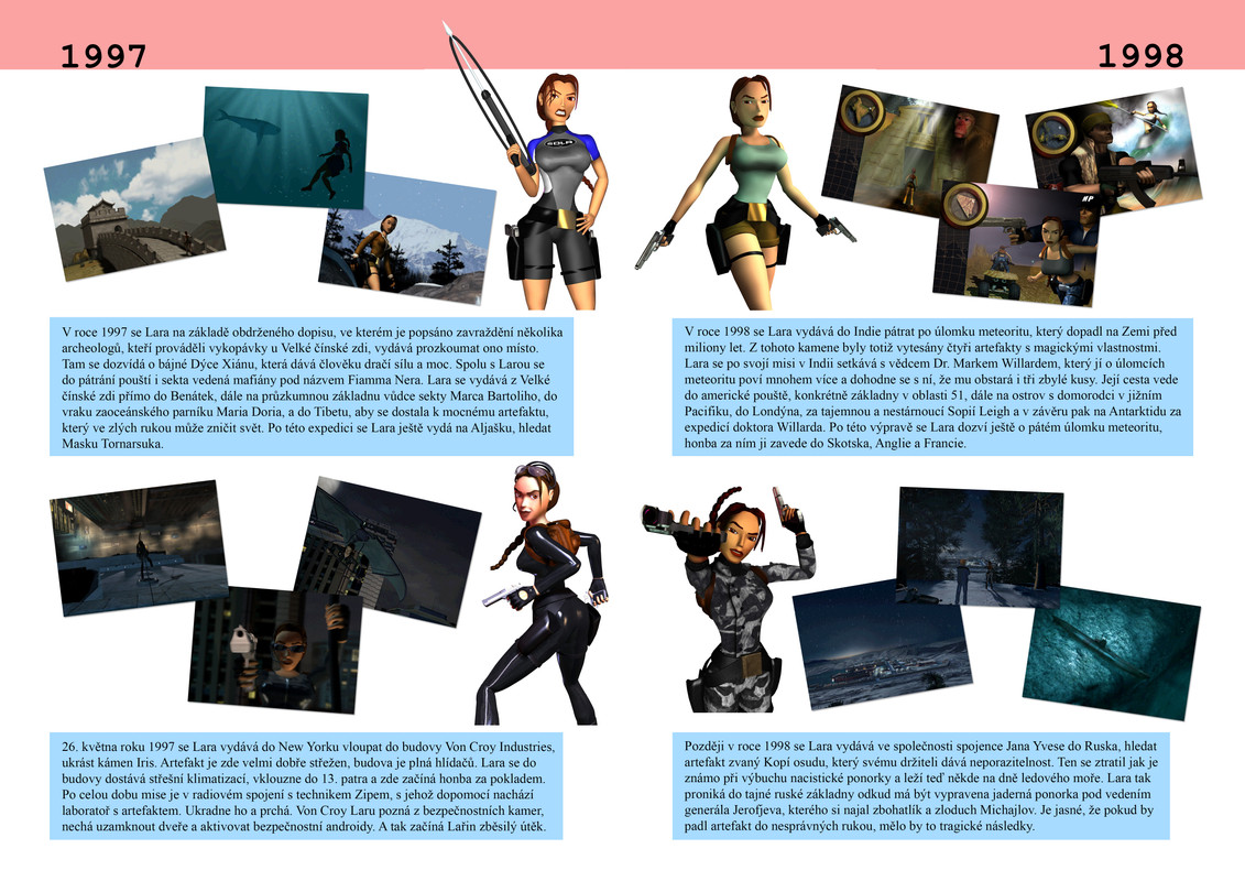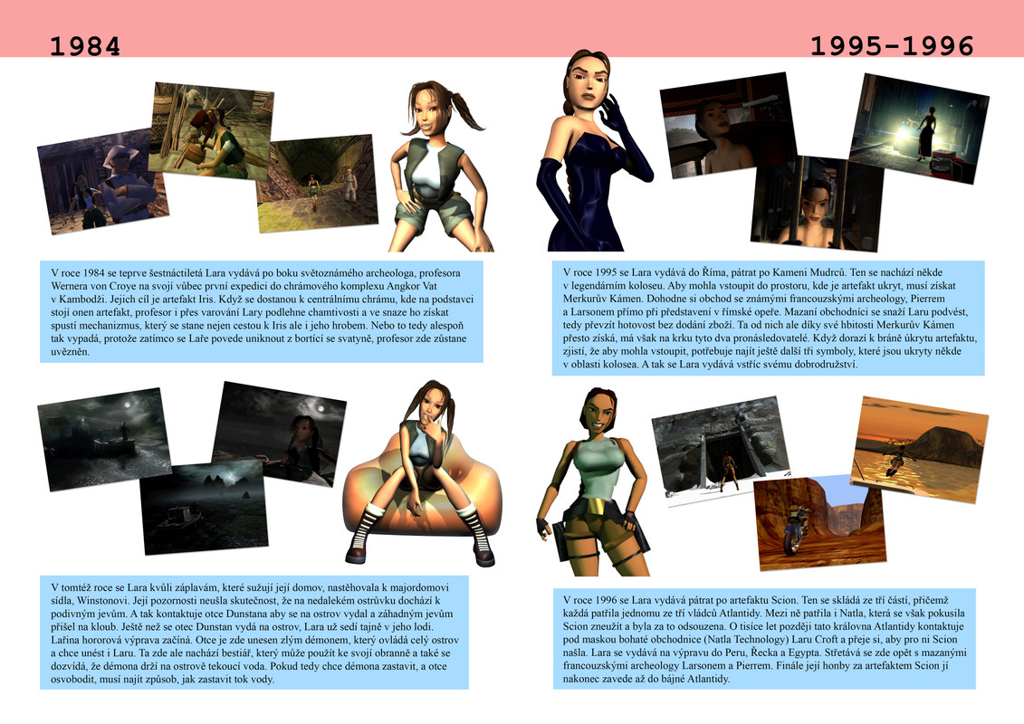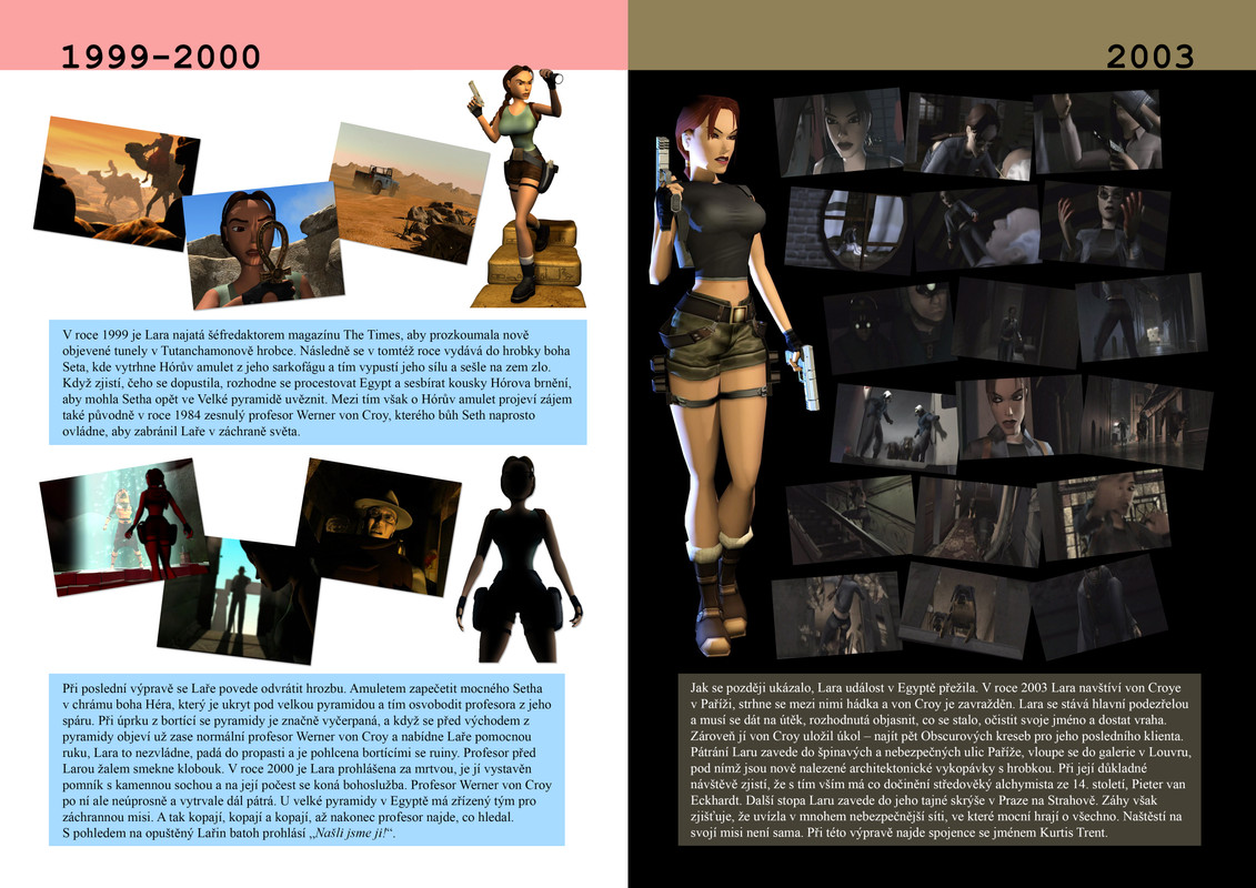 Prozatím nemám dořešenou korekturu a je to hodně takové neprofesionální, spíše jak to vidím já. Jedná se o abecední systém řazení témat. Vzorem mi je jedna moje archivní francouzská knížka "Lara Croft Les Carnets Secrets" ale moje veze by měla být v mnohem lepším provedení dvoluji si řícit a bez té neesteticky působící editace obrázků. Zde slíbená malá ukázka. Název 25 let bude zrušen neboť výroční termín jsem vypustil. Celkový rozsah bude cca 120 stran, a jde pouze o hry od CORE Design. Žadný Crystal Dynamics.