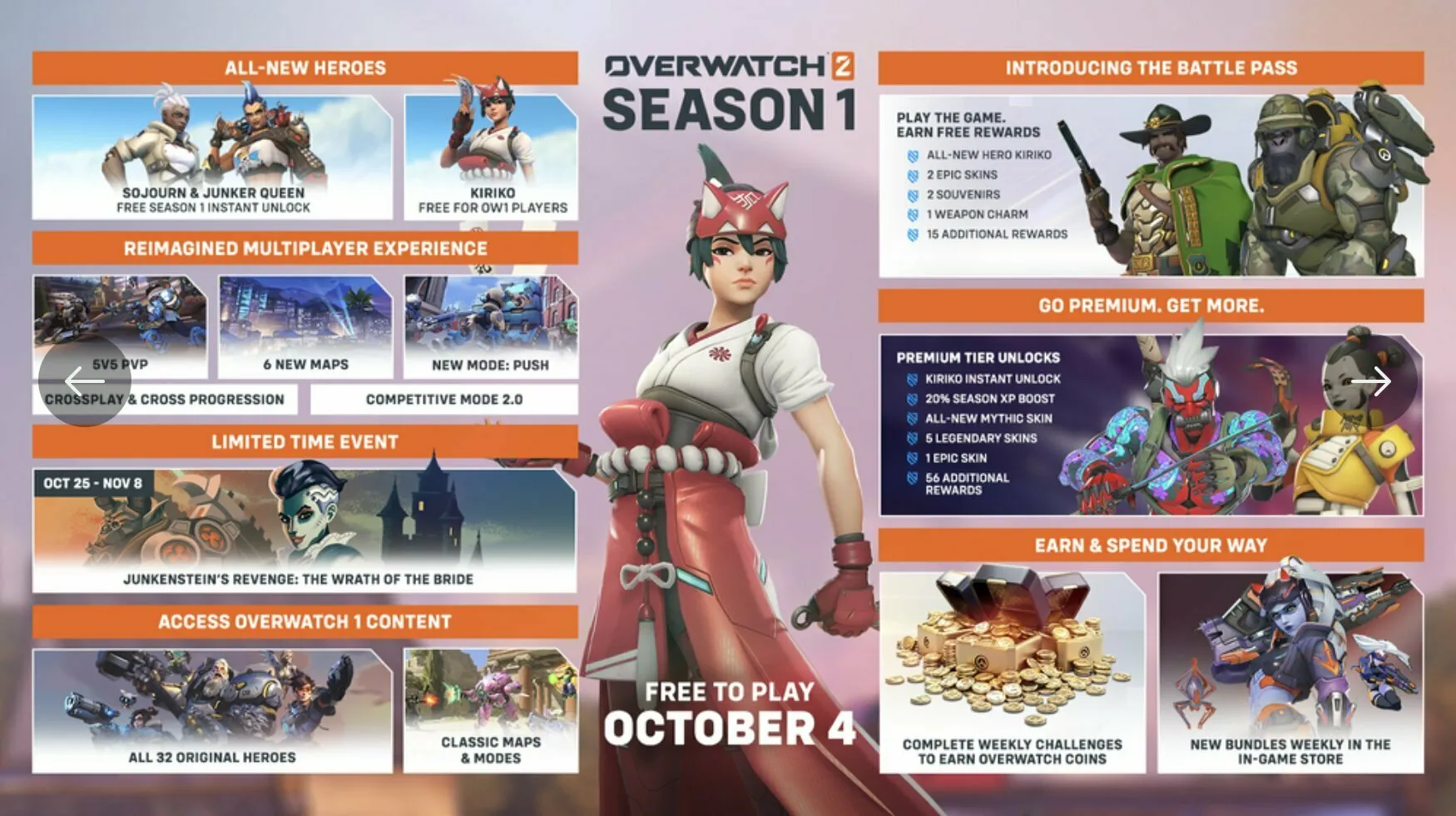 Už dříve jsme se dozvěděli, že hra Overwatch 2 bude mít Battle Pass, který bude stát 1000 Overwatch coinů, což je zhruba 10 euro. Skrze Battle Pass se budou odemykat různé kosmetické doplňky, jako je tomu třeba ve Fortnite nebo Destiny 2, ale také zcela noví hrdinové.