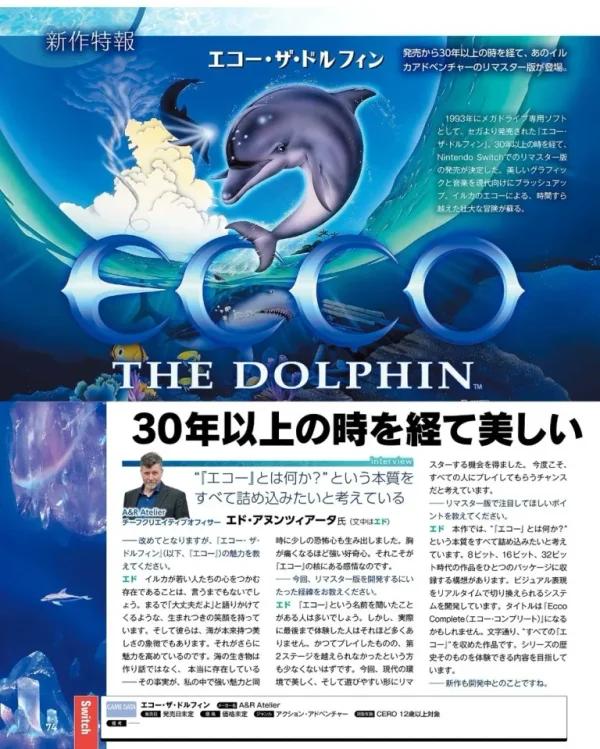 Tvůrce série Ed Annunziata navíc v magazínu uvedl, že je v současnosti plán zahrnout 8bitovou, 16bitovou a 32bitovou verzi hry do jednoho balíčku a umožnit hráčům přepínat mezi vizuálními styly v „reálném čase“, což zní opravdu dobře. Ed Annunziata následně ještě dodal, že v současnosti nemají název pro kolekci, která bude obsahovat oba dva remasterované díly, ale ve studiu je favoritem „Ecco Complete“. Jak to ale nakonec bude, se s největší pravděpodobností dozvíme letos v dubnu, kdy má dle oficiální stránky dojít k velkému představení. Budeme vás informovat.