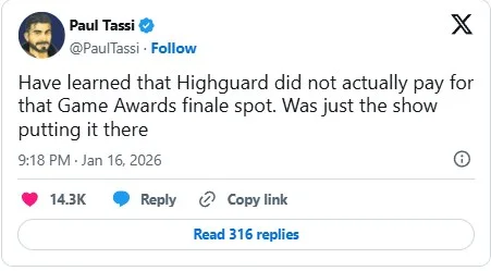 Nyní herní novinář Paul Tassi z Forbesu přišel s informací, že rozhodnutí odhalit hru Highguard v samotném závěru The Game Awards nebylo přímo na vývojářích, přičemž za tento lukrativní spot ani nezaplatili. To dává ostatně smysl, protože Wildlight Entertainment je menší studio o zhruba 100 vývojářích, které nemá za sebou velkého vydavatele. Někteří proto začali spekulovat, že se tam objevila jen z důvodu, že si její hraní moderátor a producent Geoff Keighley užil a chtěl ji více zviditelnit.