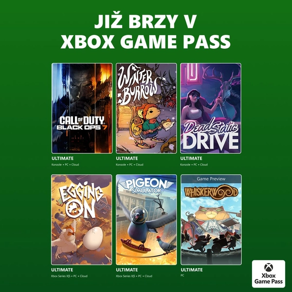 - 14. listopadu - Call of Duty: Black Ops 7 (Cloud, Xbox a PC) – Game Pass Ultimate, PC Game Pass