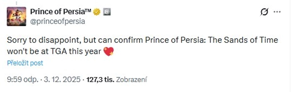 O Prince of Persia stejně asi nikdo zájem nemá, ta hra byla tak dlouho ve vývoji, že bude v době vydání vypadat jako 10 let stará, z trailerů vypadá směšně, naopak Resident Evil Requiem vítám, to se mi líbí.