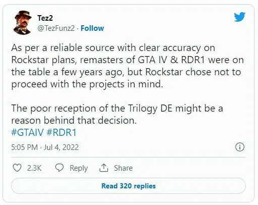 Spustil se z části oprávněný a z části neoprávněný hate REMASTERU trilogie (každý asi čekal remake) která tak špatná, jak se mnozí na internetu hroutili nebyla no a teď je logické, že po tom hejtu si R* další věci rozmyslí. Zrovna GTA 4 bych si rád dál, ale bohužel. Zatím.
