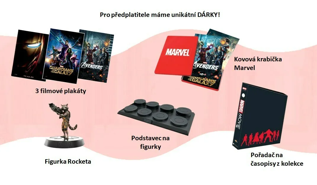 Objednejte si předplatné, protože kromě nižší ceny si zajistíte také unikátní dárky. Najdete mezi nimi: 3 filmové plakáty, pořadač na časopisy z kolekce, podstavec na figurky, figurku Rocketa a kovovou krabičku Marvel.