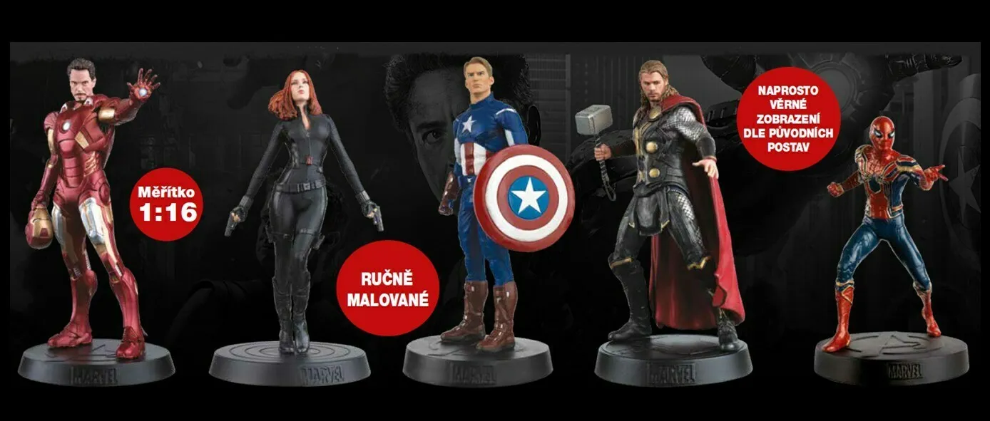 Tyto oficiální sběratelské figurky jsou vyrobené z metalicky pigmentované pryskyřice a ručně malované. Představují nejdůležitější kladné a záporné hrdiny z filmů Marvel Studios.