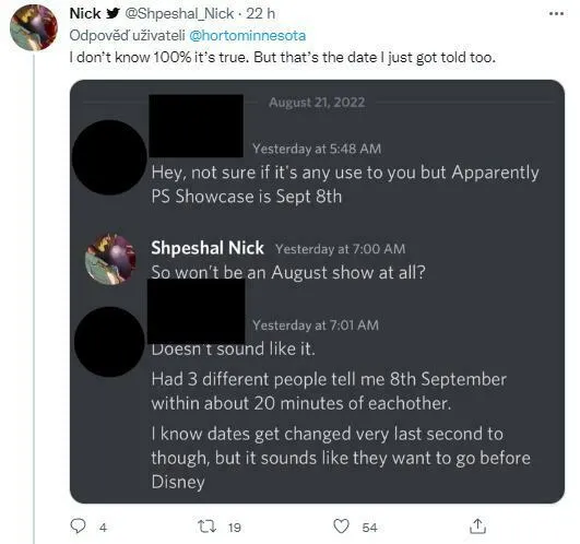 Účet News Videogames na twitteru přišel s informací, že se prezentace PlayStationu bude konat 8. září. Na tuto zprávu zareagoval i celkem známý insider Nick Baker z Xbox Era, který měl stejné datum slyšet o několik dní dříve. Je ovšem nutné dodat, že Nick Baker se už několikrát trefil, ale také mnohokrát se svými zaručenými teasery či odhaleními pohořel. V minulém roce třeba lákal na návrat sérií inFamous nebo Sly Cooper, což bral jako hotovou věc. Jak ale nyní už víme, ani na jedné sérii se v současnosti nepracuje.