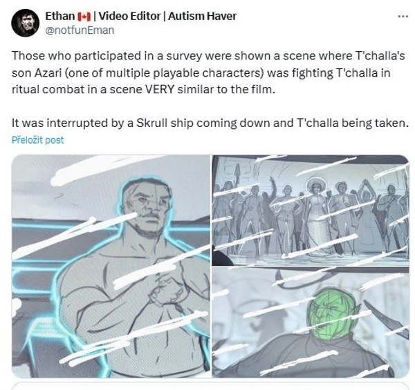 Ve svých příspěvcích notfunEman tvrdí, že jsme ve hře měli hrát za T’Challova syna Azariho a hlavními protivníky byli Skrullové. Sám údajně mohl vidět scénu ze začátku hry, v níž Azari bojoval v rámci rituálu se svým otcem, přičemž záhy se na scénu dostali Skrullové, kteří Tchalla unesli. Zajímavostí je, že jsme neměli ve hře hrát jen za Azariho, ale také za několik dalších postav, které ovšem nejsou zmíněny, takže můžeme jen spekulovat, jaké to byly. Níže se můžete podívat na některé zveřejněné artworky.