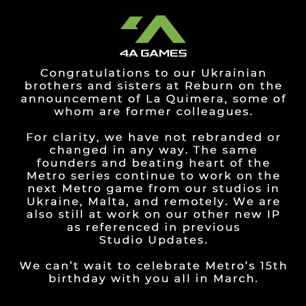 Je nutné dodat, že druhé studio 4A Games se sídlem na Maltě toto oznámení nemá žádný vliv, to stále pracuje na sérii Metro.