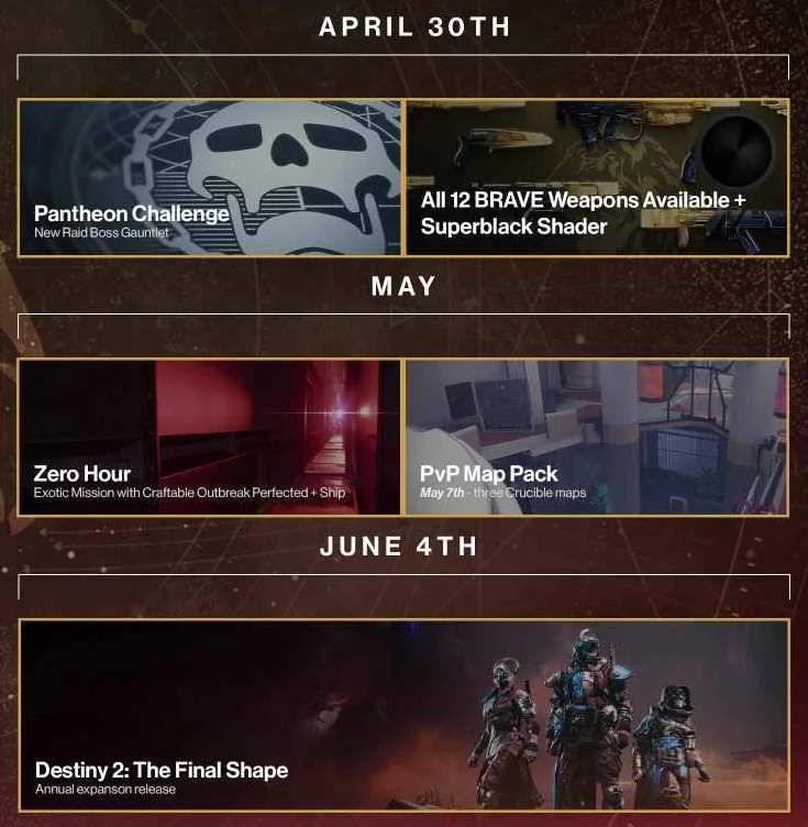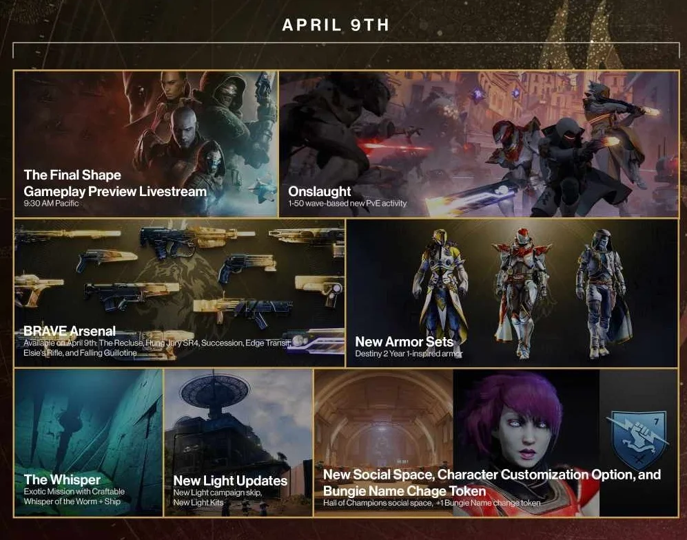 Už dnes začíná v Destiny speciální event Into the Light, jenž přináší zcela nový režim pro tři hráče Onslaught, v němž je možné získat speciální BRAVE zbraně. Jde o hráči oblíbené zbraně, které se už v minulosti v Destiny objevily, přičemž některé už není možné získat nebo jsou uzamknuty na menším levelu. Nyní bude možné tyto zbraně získat ve vylepšené BRAVE verzi skrze nový režim. Kromě toho vývojáři přidali i nové sety brnění, nový sociální prostor a vracejí dvě starší exotické mise The Whisper a Zero Hour. V květnu pak vyjde i balíček nových PvP map.