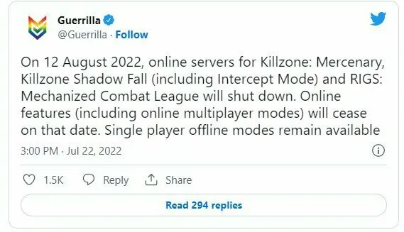 Studio Guerrilla Games brzy vypne online servery u her Killzone a RIGS