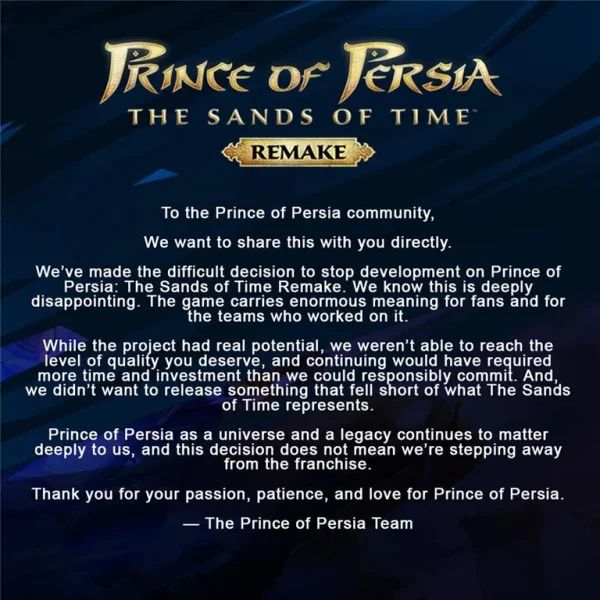 Zrušení remaku Prince of Persia: The Sands of Time je opravdu bolestivé, zvláště po několika odkladech, restartu vývoje, přechodu k vývojářům v Ubisoft Montreal a ještě nedávných prohlášeních, že vývoj jde velmi dobře a v brzké době se dozvíme více podrobností. Ty už bohužel nepřijdou.