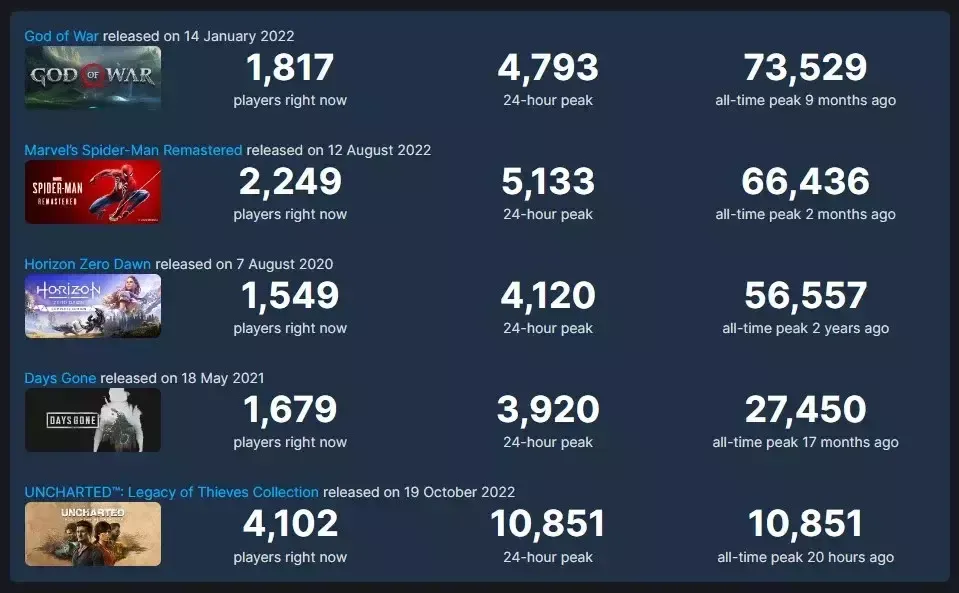 Horizon Zero Dawn leads the list, with 2.3 million units sold and $60 million in revenue on PC. It is followed by God of War (971k units sold and $26.2 million in revenue) and Days Gone (825k units sold and $22.7 million in revenue)