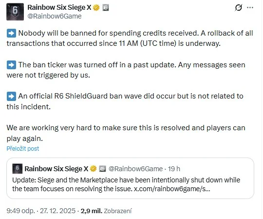 Velký hackerský útok na servery hry Rainbow Six Siege X, rozdávaly se bany i herní kredity