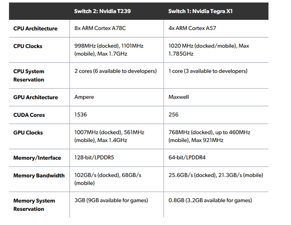 Dostáváme se ke GPU. Zatímco první Switch používal Nvidia Maxwell z řady GTX 900, Nintendo Switch 2 má architekturu Ampere, kterou lze vidět u řady RTX 30. Potvrzeno je 1536 jader CUDA, taktovací frekvence pak 561 MHz v handheld režimu a 1007 MHz v docku. Aby bylo možné si představit výkon, ten je podle Nintenda 3,072 TFLOP v dockovém režimu a 1,71 TFLOP v handheldovém. Výkon by tak měl být v dockovém režimu režimu výrazně vyšší než u základní PS4 nebo Xbox One, ale je nutné si uvědomit, že jde pořád jen o číslo na papíře. Čeho je konzole skutečně schopna, ukážou až samotné hry. Co ale nyní víme, je to, že GPU podporuje DLSS, stejně jako ray-tracing.