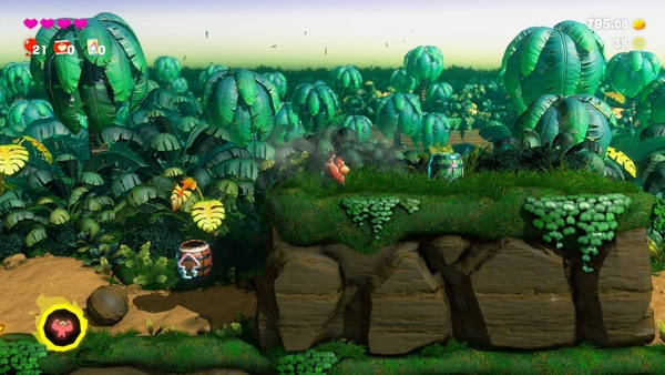 Donkey Kong má velkou sílu a tak umí boucháním do země hloubit cestičky, ničit stěny a prakticky vše, co mu přijde do cesty. Díky tomu má značně usnadněné zdolávání překážek, ale také se tato mechanika hodí během průzkumu, protože nikdy nevíte, co se pod povrchem ukrývá. Někdy jen truhla s důležitou mapou, ale také může pod ním být chutný banán. Také se mi líbí, že může DK vytrhávat kus země a házet ji po nepřátelích, případně si tak pomáhat při řešení hádanek. Ničení světa je zábavné a uspokojující, zvláště když nejde jen o gimmick, ale o plnohodnotnou součást hratelnosti.