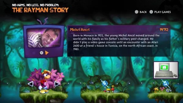 Na Rayman: 30th Anniversary Edition se mi hrozně líbí zpracované menu, které je moc pěkné a kromě jednotlivých her, k nimž je jednoduchý přístup, obsahuje i bonusový materiál. V něm najdete různé artworky, tiskové zprávy, designové dokumenty, informace i přes 50 minut rozhovorů s klíčovými vývojáři, mezi nimiž nechybí Michel Ancel. Tento bonusový materiál je zajímavý a u podobných her ho vítám.