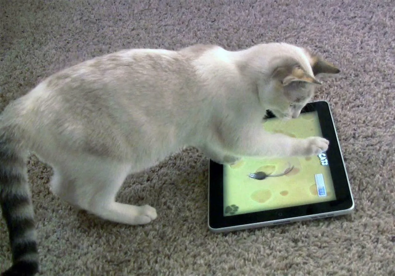 Další vyřazenou kategorií jsou pochopitelně videohry určené pro samotné kočky, respektive aplikace vytvořené pro tablety, ve kterých kočičí mazlíčci loví virtuální myši nebo rybky. Takové aplikace jsou v současnosti hodně rozšířené a paradoxně cílí více na majitele koček chtějící svým miláčkům dopřát všemožné rozptýlení, než aby měly za cíl skutečně zabavit koncového zákazníka s fousky a ostrými drápky. Vždyť každý správný chovatel ví, že kočky nejsou příliš dobré v rozeznávání barev a na kratší vzdálenost vidí rozostřeně. Zabavit kočku s pomocí tabletu je tak poměrně náročné. Už jen tím, že kočičí zrak reaguje na displej podobně jako lidské oko, a tudíž musí být kočka nastavena k obrazovce ve správném úhlu, což je při její hyperaktivitě obtížné. A to nemluvě o tom, že podobná „inteligentní“ zábava může skončit poškozením skla displeje kočičími drápy, neboť váš mazel bude těžko řešit, zdali máte tablet s tvrzeným sklem, či levnější model.